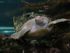Sally the Sea Turtle swimming in her massive tank. Ripley's Aquarium of the Smokies, Gatlinburg, Tennessee. 2019.